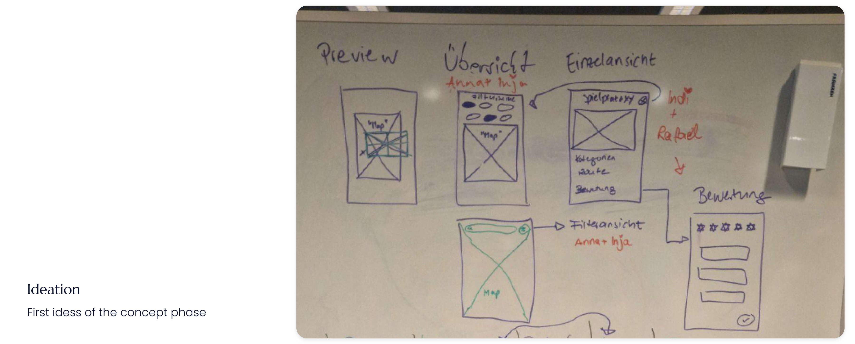 For the conceptual phase, wireframes were first created on a whiteboard. These were then divided among the team and developed into more detailed prototypes in Figma. The prototypes were implemented component by component. After completing the implementation of a feature, the results were reviewed by other team members to ensure the feature could be marked as completed.