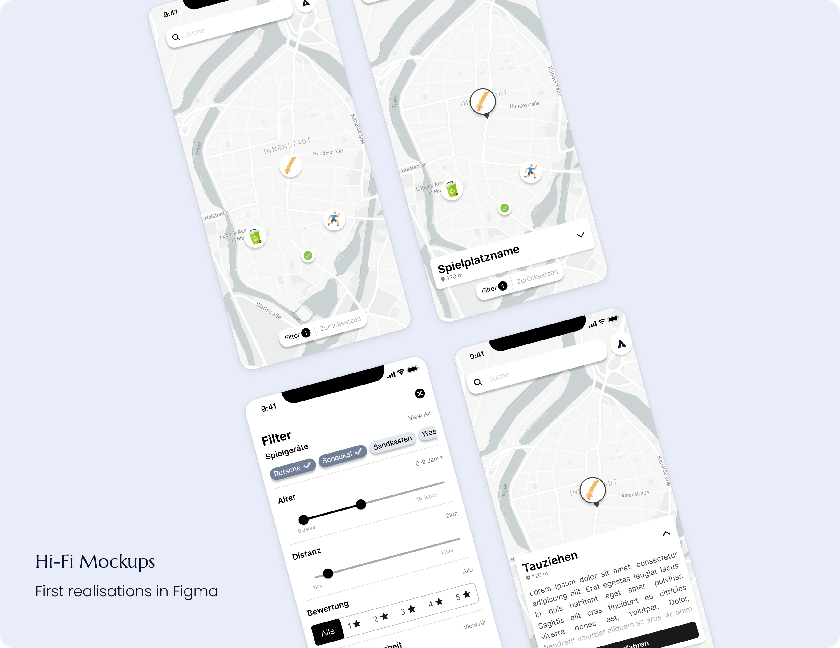 To prevent users from being overwhelmed with irrelevant information, a filtering feature was implemented. In the current prototype, users can filter playgrounds by equipment, distance, children’s age, rating, and accessibility. When a filter is applied, only playgrounds matching the specified criteria are displayed on the map.
